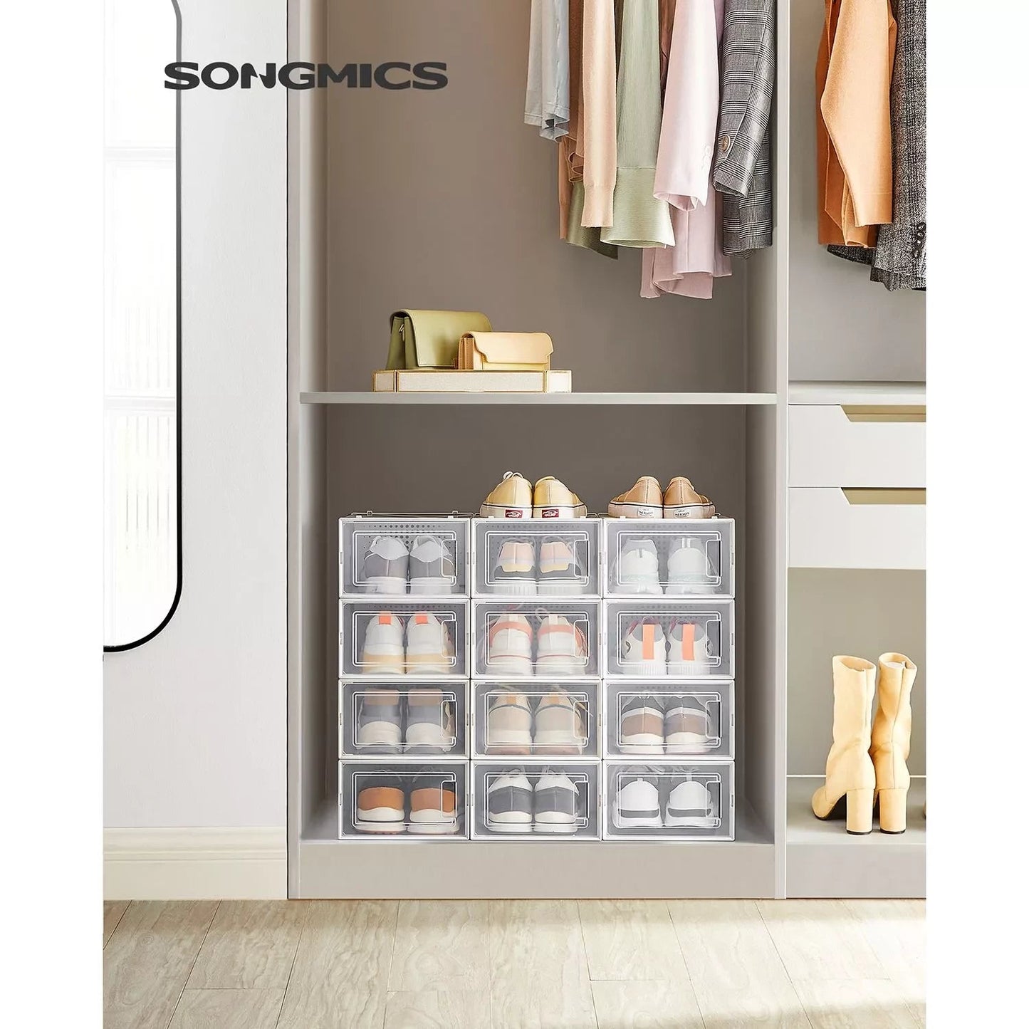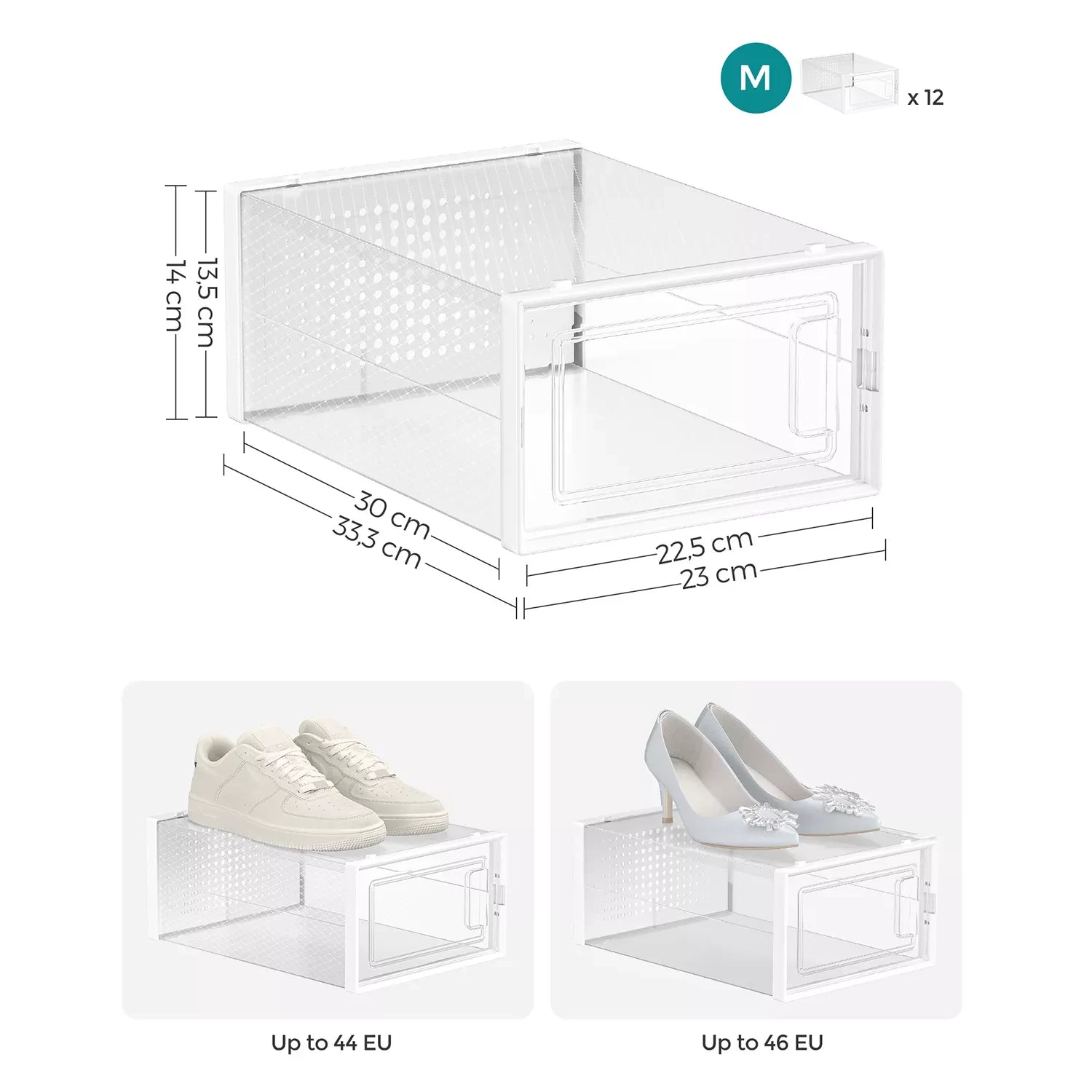 Keine chaotischen Schuhstapel mehr: Werfen Sie Ihre Schuhe jedes Mal einfach in den Schrank, sodass nach einer Weile ein chaotischer Schuhstapel entsteht? Befreien Sie sich von dieser schlechten Angewohnheit! Kaufen Sie diese 12 Schuhkartons und bewahren Sie alle Ihre Schuhe sauber und ordentlich auf, bis Sie sie das nächste Mal tragen. Schuhe effizient organisieren: Alle Schuhe bis Größe 44 passen in diese Boxen und können staubfrei gelagert werden. Brauchen Sie weiße Sandalen? Finden Sie sie auf einen Blick, öffnen Sie die Tür jeder Box und entnehmen Sie Ihre Schuhe ganz einfach. Perfekt, wenn Sie es morgens eilig haben! Noch besser ist jedoch, dass mehrere dieser Boxen platzsparend übereinander gestapelt werden können und sich somit hervorragend für Ihren Flur, Ihre Garderobe oder Ihr Lagerregal eignen. Produktdetails: Farbe: transparent weiß Material: Korpus aus PP (Polypropylen), Tür aus PP (Polypropylen) Maße pro Box: 33,3 x 23 x 14 cm (L x B x H) Innenmaße pro Box: 30 x 22,5 x 13,5 cm (L x B x H) Gewicht: 3,5 kg Lieferumfang: 12 x Schuhkarton 1 x Anleitung Inand Outdoormatch Hinweise: Befolgen Sie die Montageschritte in der Anleitung und im Video, um das Produkt zusammenzubauen. Wenden Sie bei der Demontage auch keine Gewalt an. Bitte messen Sie Ihre Schuhe vor dem Kauf und prüfen Sie, ob sie in diese Schuhkartons passen.