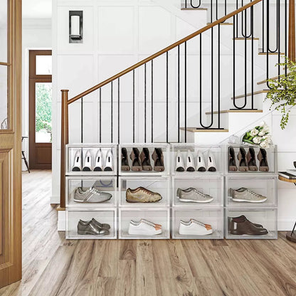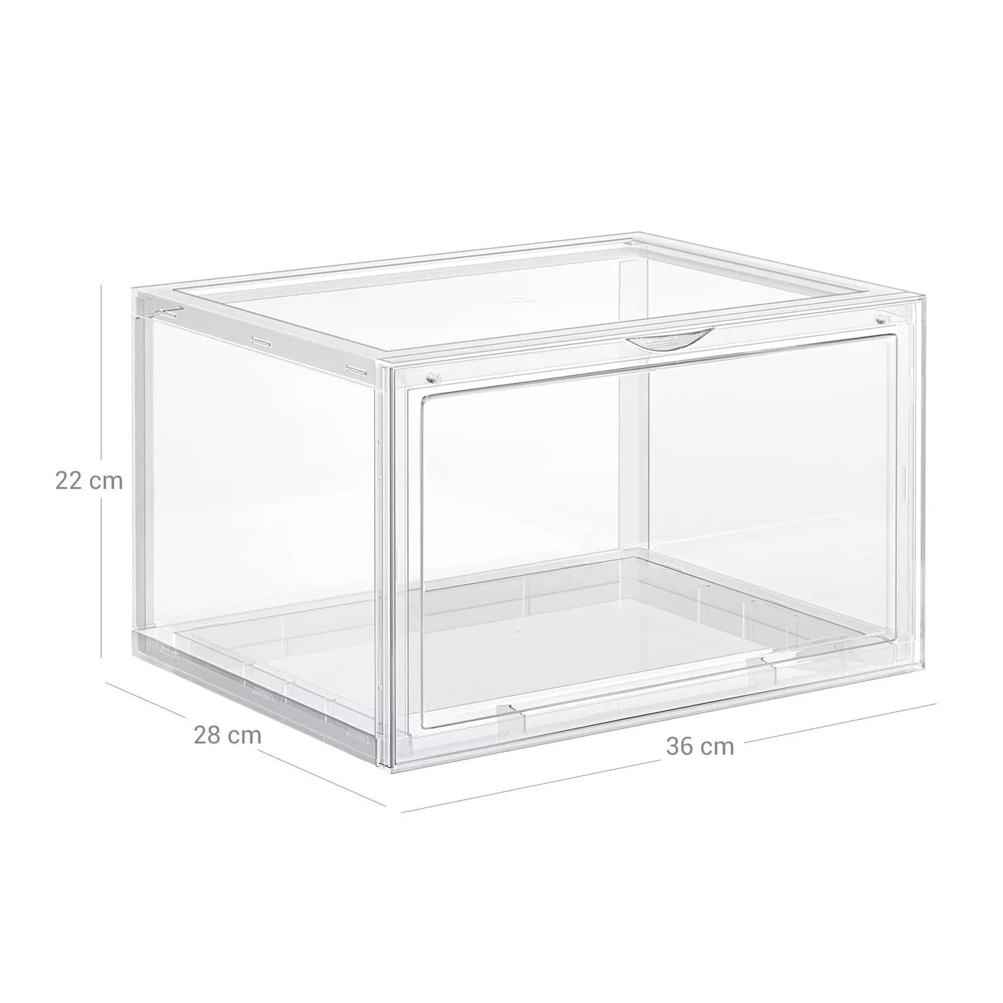 ECHTE AUFBEWAHRUNGSHELDEN: Wo habe ich meine weißen Sandalen hingelegt? Oh nein, meine Ballerinas sind schon wieder weg! Keine Sorge, Ihre Helden kommen schon näher – diese praktischen Schuhkartons von Inand Outdoormatch! Sie sorgen dafür, dass die anstrengende Suche endlich ein Ende hat! Dank des transparenten Gehäuses und der praktischen Falttür können Sie die benötigten Schuhe schnell erkennen und bequem darauf zugreifen. FÜR VERSCHIEDENE SCHUHE GEEIGNET: Schuhe bis Größe 46, egal ob Sneaker, High Heels oder Stiefel, passen perfekt in diese Kunststoffboxen und präsentieren sich stilvoll. STAPELBAR: Dank des smarten Designs passen Ober- und Unterseite der Boxen perfekt zusammen So können mehrere Kunststoffboxen stabil übereinander gestapelt werden. So schaffen Sie einen kompletten Schuhschrank und sparen mehr Platz. Darüber hinaus sorgt das verstärkte Material für eine lange Lebensdauer. Produktdetails: Farbe: transparent Material: Korpus aus PP (Polypropylen), Tür aus PS (Polystyrol) Maße pro Box: 36 x 28 x 22 cm (L x B x H) Innenmaße pro Box: 33,5 x 25,5 x 19 cm (L x B x H) Gewicht: 6,2 kg Lieferumfang: 6 x Schuhkarton 1 x Anleitung (DE, EN, FR, IT, ES) Indoor- und Outdoor-Wettkampf Hinweise: Bauen Sie das Produkt streng nach der Anleitung um. Bitte messen Sie Ihre Schuhe vor dem Kauf und stellen Sie sicher, dass sie in diese Schuhkartons passen.