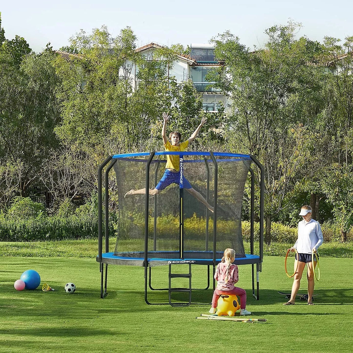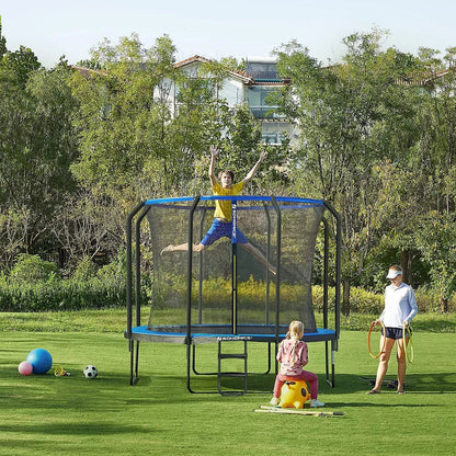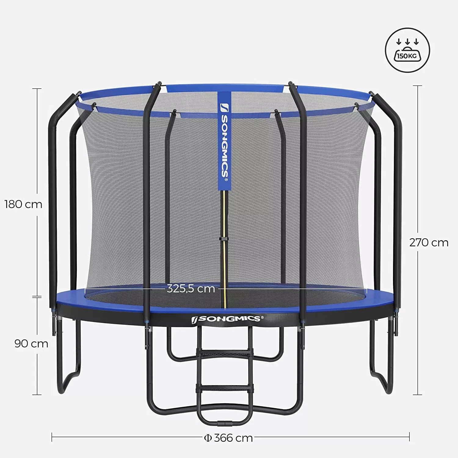 In And OutdoorMatch Trampolin Adolfo – 366 cm – Blau – Trampolin mit Sicherheitsnetz und Leiter – gepolsterter Rahmen – für Kinder und Erwachsene – Innennetz