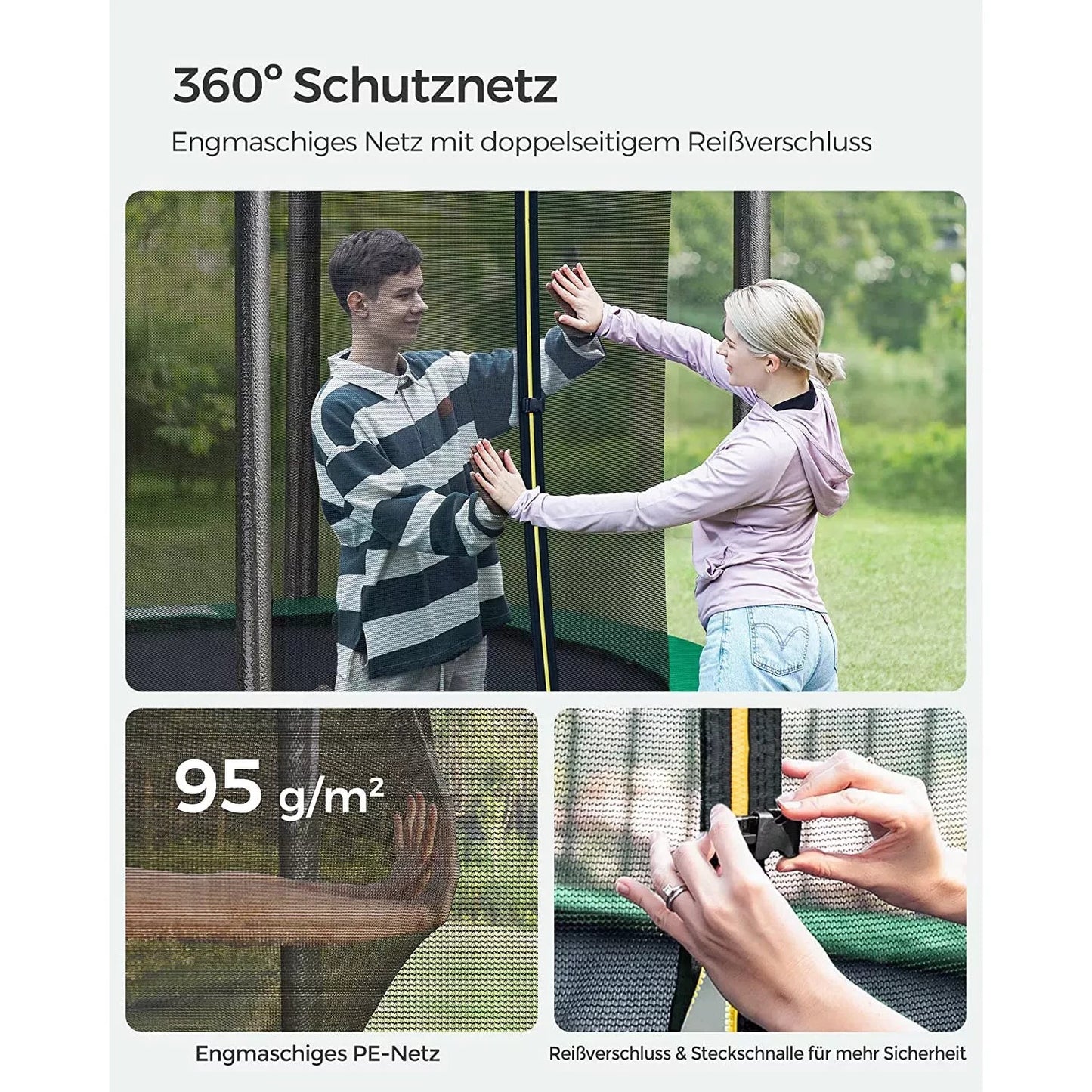 Dieses 2020 neu auf den Markt gebrachte Trampolin von InandOutdoormatch bietet sowohl Ihnen als auch Ihrer Familie ein 1A-Sprungerlebnis. Da Sicherheit bei uns an erster Stelle steht, ist der verzinkte und pulverbeschichtete Rahmen stabil und rostbeständig. Die 4 W-förmigen Beine halten das Sprungtuch im Gleichgewicht. Dieses Sprunggerät ist natürlich als Geschenk für Ihre Kinder gedacht. Sie können es aber auch ausprobieren, denn das Trampolin ist bis zu 150 kg belastbar. Im Lieferumfang sind ein Sprungtuch, eine Randabdeckung, ein Sicherheitsnetz, Handläufe und eine Leiter enthalten – alles, was Sie für den Spaß im Freien brauchen! Produktdetails: - Farbe: Schwarz-Dunkelgrün - Material: - Beine, Sicherheitsnetzrand: verzinkter Stahl, pulverbeschichtet - äußerer Ringrahmen, T-förmige Verbinder: verzinkter Stahl - Federn: Zink - Leiter: PP-Kunststoff (0,9 g). /cm), Stahlrohr - Sprungmatte: PP-Kunststoff (265 g/m) - Randabdeckung: PVC (310 g/m), EPE-Schaum - Sicherheitsnetz: PE-Kunststoff (95 g/m) - Maße: - Rahmen mit Sprungfläche: 305 x 76 cm (x H) - Sicherheitsnetz: 180 cm (H) - Leiter: 41 x 105 cm (B x H) - Abstand zwischen Boden und Trampolinoberfläche: 76 cm - Gewicht: 48,4 kg (25,4 + 23 kg) - max. statische Tragfähigkeit: 150 kg. Lieferumfang: - 1 x Trampolin - 1 x Leiter - 1 x Zubehörpaket - 1 x Bedienungsanleitung (DE, EN, IT, FR, ES)