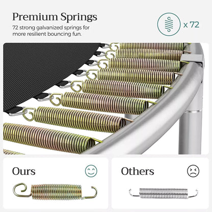 Viel Spaß im Garten! Dieses 305 cm lange Trampolin eignet sich perfekt, um an einem warmen Nachmittag in den Garten zu gehen und zu springen (oder sogar an Ihrer Fitness zu arbeiten). Lassen Sie Ihre Kinder nach Herzenslust auf diesem Inand Outdoormatch-Trampolin springen, während Sie sich in der Sonne bräunen oder einen schönen Grillabend veranstalten. Allerdings sollte die Sicherheit nicht außer Acht gelassen werden. Aus diesem Grund ist dieses Trampolin mit einem sehr feinmaschigen Sicherheitsnetz ausgestattet, das einen Aufprall besonders gut absorbiert. Darüber hinaus sind die Netzpfosten und Federn mit EPE-Schaum ummantelt, was ebenfalls die Verletzungsgefahr verringert. 265 g/m²) - Material Sicherheitsrandpolster: PVC (310 g/m²), EPE-Schaumstoff - Abstand zwischen Boden und Trampolinoberfläche: 76 cm - Max. statische Belastbarkeit: 150 kg Lieferumfang: - 1 x Trampolin 305 cm - 1 x Leiter - 1 x Zubehörpaket - 1 x Anleitung Inand Outdoormatch Hinweise: - Das Trampolin darf jeweils nur von einer Person genutzt werden. Die gleichzeitige Verwendung durch mehr als eine Person kann zu Verletzungen führen. - Machen Sie keine Saltos auf dem Trampolin. - Nicht an der Oberkante des Sicherheitsnetzes hängen. - Entfernen Sie alle spitzen oder scharfen Gegenstände, bevor Sie das Trampolin betreten. - Das Trampolin ist nicht für die Nutzung durch Kinder unter 3 Jahren geeignet. - Nur für den privaten Gebrauch geeignet.