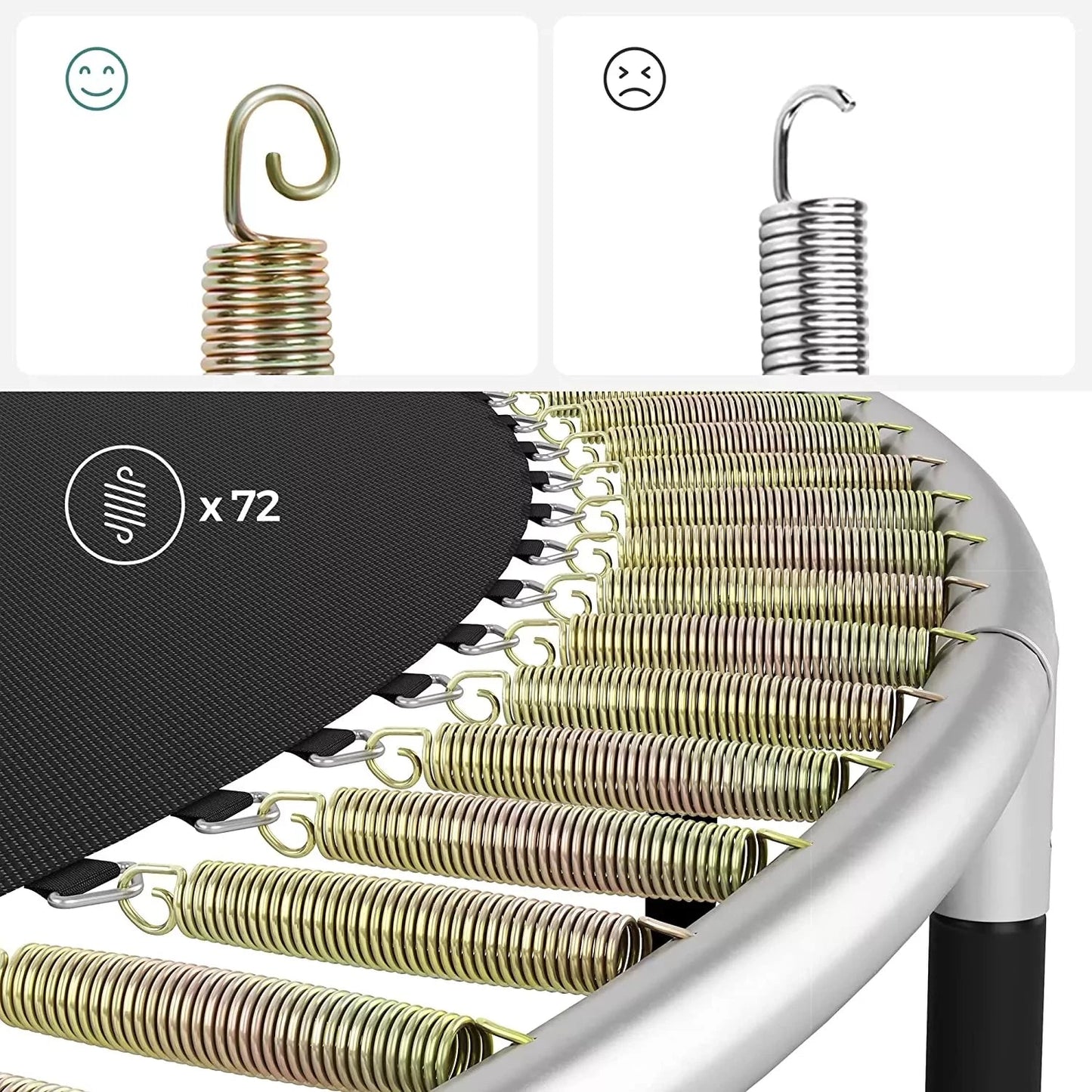 Spaß im Garten: Dieses Trampolin von Inand Outdoormatch bietet Ihnen und Ihrer Familie ein 1A-Sprungerlebnis. Da Sicherheit bei uns an erster Stelle steht, ist der verzinkte und pulverbeschichtete Rahmen stabil und rostbeständig. Die 4 W-förmigen Beine halten das Sprungtuch im Gleichgewicht. Dieses Sprunggerät ist natürlich als Geschenk für Ihre Kinder gedacht. Sie können es aber auch ausprobieren, denn das Trampolin ist bis zu 150 kg belastbar. Im Lieferumfang enthalten sind ein Sprungtuch, eine Randabdeckung, ein Sicherheitsnetz, Handläufe und eine Leiter – alles, was Sie für den Spaß im Freien brauchen! Produktdetails: Farbe: Dunkelblau Material: Beine, Sicherheitsnetzkante: Verzinkter, pulverbeschichteter Stahl. Äußerer Ringrahmen, T-Bar-Verbindungen: Verzinkter Stahl. Federn: Zink. Leiter: PP-Kunststoff (0,9 g/cm), Stahlrohr. Sprungmatte : PP-Kunststoff (265 g/m) Randabdeckung: PVC (310 g/m), EPE-Schaum Sicherheitsnetz: PE-Kunststoff (95 g/m) Abmessungen: Rahmen mit Sprungfläche: 366 x 90 cm (x H) Sicherheitsnetz : 180 cm (H) Leiter: 41 x 105 cm (B x H) Abstand zwischen Boden und Trampolinoberfläche: 90 cm Max. statische Tragfähigkeit: 150 kg. Lieferumfang: 1 x Trampolin 1 x Leiter 1 x Zubehörpaket 1 x Bedienungsanleitung