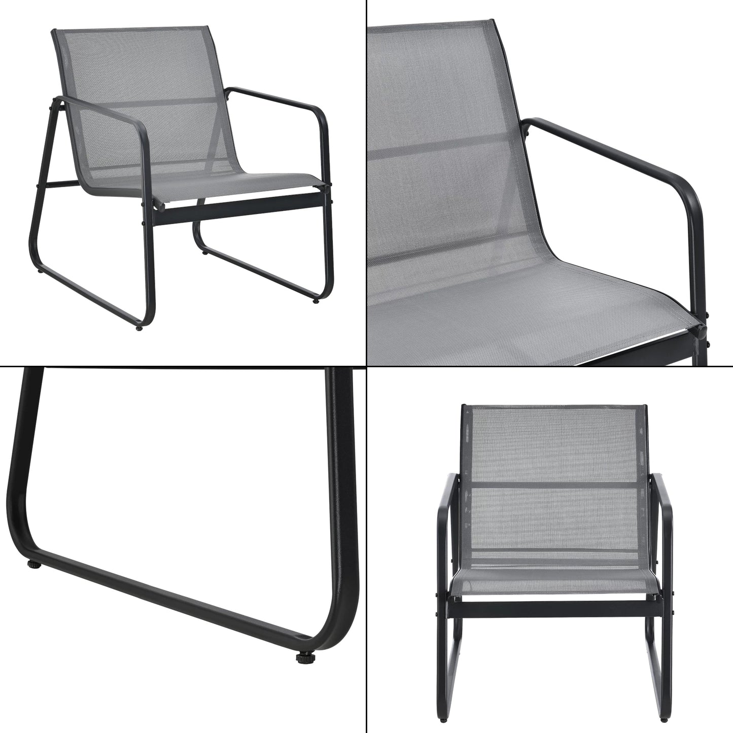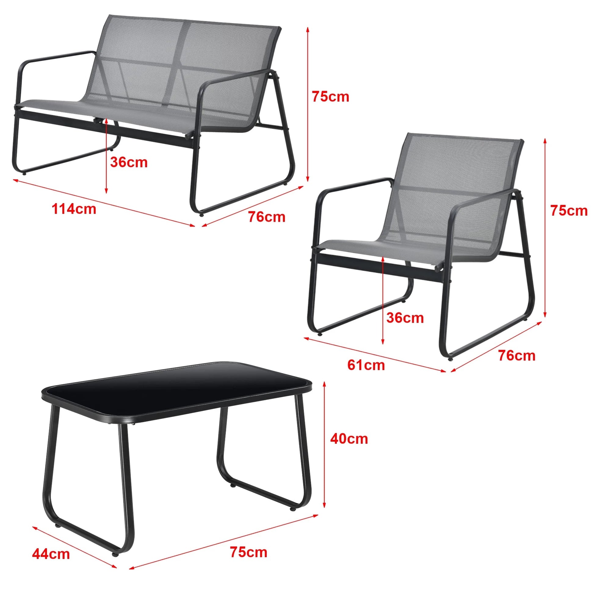 Dieses stabile und optisch ansprechende Gartenmöbel-Set mit Stahlgestell ist nicht nur elegant und schick, sondern punktet auch durch seine hervorragende Verarbeitung und sein elegantes Design. Das Set besteht aus 1 kleinen Tisch, 1 Bank und 2 Stühlen.