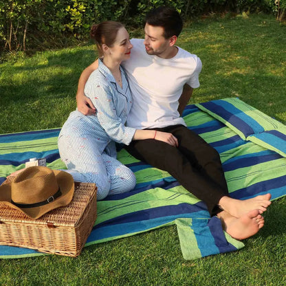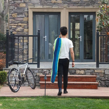 Ein perfekter Sitz- und Liegeplatz drinnen und draußen / für Jung und Alt! Absoluter Hingucker. Was gibt es Schöneres, als sich nach einem anstrengenden Tag in den InAndOutdoorMatch-Hängesessel zu stürzen und die Seele eine Weile baumeln zu lassen. Beim entspannenden und wohltuenden Schaukeln werden Sie sich körperlich und geistig wohlfühlen. Frische, fröhliche Farben und eine riesige Stofffläche machen unseren Hängesessel zu einer Oase der Ruhe für Sie. Ob im Garten, auf dem Balkon oder auf dem Campingplatz, die große Planenfläche verspricht jede Menge Komfort. Unsere Matte ist ultraleicht, langlebig und stabil. Es kann als Sofa, Schaukel und sogar als Wiege für Kinder dienen. Bei Bedarf können sie in einen Hängemattenständer eingeklemmt oder einfach zwischen zwei Bäumen befestigt werden!Das geringe Gewicht und die kompakten Abmessungen machen die Hängematte zum idealen Begleiter.Hinweis:1. Befolgen Sie beim Entfalten die Reihenfolge der Faltschritte der Hängematte, damit Sie die Matte wieder richtig falten und in die Tasche stecken können.2. Beaufsichtigen Sie die Kinder, wenn sie in der Hängematte spielen.3. Die Farbe der Hängematte kann geringfügig vom gezeigten Produktbild abweichen, dies ist auf das Licht und die Farbwiedergabe des Bildschirms zurückzuführen.4. Bedenken Sie, dass sich eine Hängematte bei Gebrauch ausdehnt. In diesem Fall müssen Sie das befestigte Seil kürzen. Beachten Sie jedoch, dass der tiefste Punkt der beladenen Hängematte 20–40 cm über dem Boden liegen sollte. Vermeiden Sie es außerdem, die Hängematte stärker zu spannen. 5. Die Aufhängegurte und notwendigen Haken sind nicht im Lieferumfang enthalten. Diese können aber separat bei uns bestellt werden. Produktdetails: - Material: 70 % Baumwolle + 30 % Polyester, 320 g/m² - Liegefläche: 210 x 150 cm - Gesamtlänge: 300 cm - Kissen: 70 x 40 cm - Querstange: 120 x 3 x 2,2 cm - max . Belastbarkeit: 300 kg Lieferumfang: - 1 x Hängematte mit Stangen - 2 x Kissen - 1 x Transporttasche