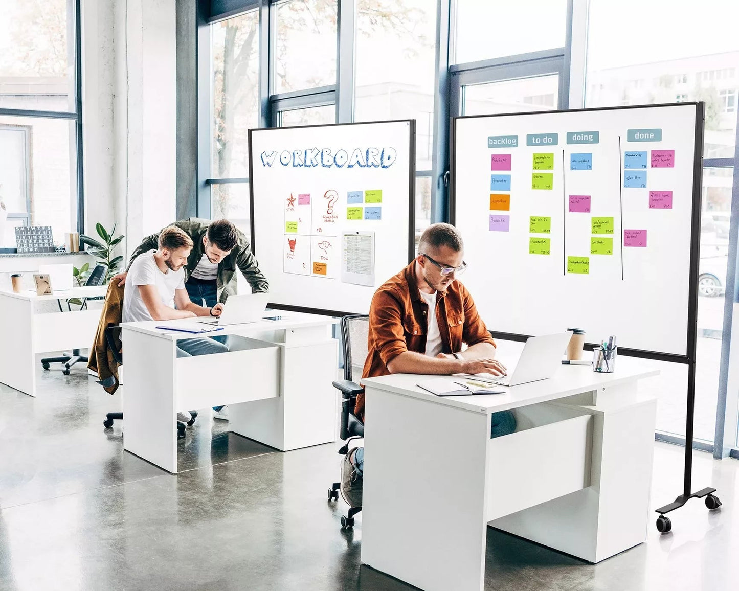 Doppelseitig beschreibbares Whiteboard auf Gestell mit 4 feststellbaren Rollen. Das schlichte Design macht es robust und leicht zugleich. Ausgestattet mit einer doppelseitigen Emaille-Schreibfläche für intensiven Gebrauch. Leicht zusammenzubauen.