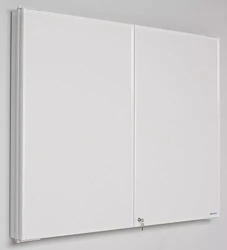 Abschließbarer Präsentationsschrank mit zwei Türen, beidseitig beschreibbar. Inklusive Design-Flipchart-Klemme. Zwei Varianten der Unterseite: Mattweißer Projektionsstahl. Geeignet für die Wandmontage oder die Platzierung auf einem weißen Mobilsockel. Lieferung mit magnetischem Stifthalter und 50 Blatt Flipchart-Papier.