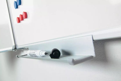 Whiteboard mit fünf Schreibflächen aus weiß emailliertem Stahl (800C). Zusätzliche Flügel bieten mehr Platz zum Schreiben. Eloxiertes Aluminium-RC-Profil mit grauen Kunststoff-Eckstücken. Inklusive Entsorgungsbehälter.