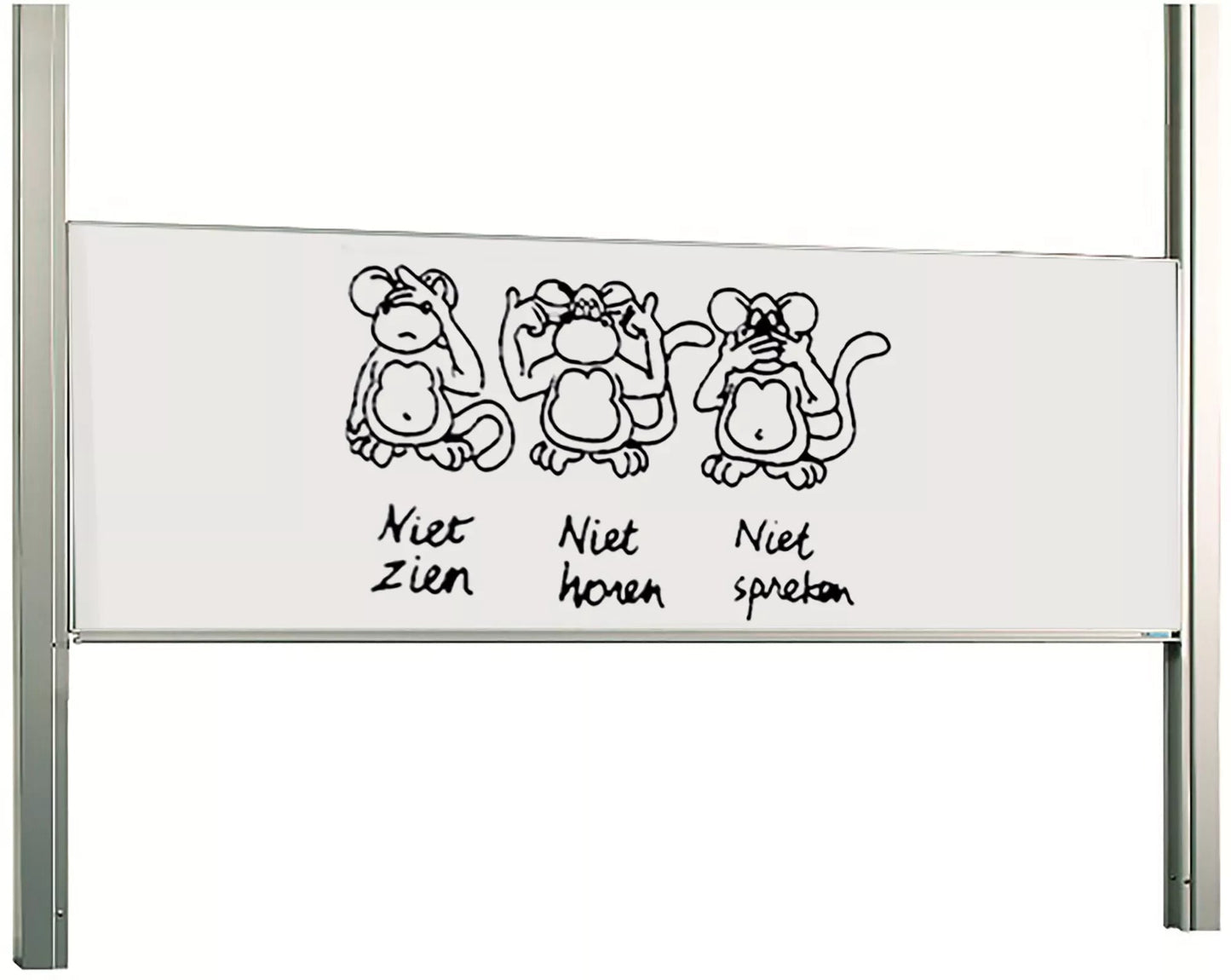 Tafel mit 1 Schreibfläche aus emailliertem Stahl weiß (800C) oder grün. Eloxiertes 19-mm-Aluminiumprofil mit Kunststoff-Eckstücken und Kreideauffangrinne. Montage zwischen zwei Säulen, Standardhöhe: 265 cm. Längere Spalten: optional.