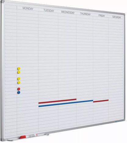 Arbeitstagesplaner mit horizontaler Einteilung von Montag bis Samstag mit 37 befüllbaren Positionen unter jedem Tag. Ausgestattet mit eloxiertem Aluminium-Softline-Profil, inklusive Montagematerial, Markierungsschale 30 cm und magnetischer horizontaler Tagesleiste.