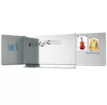Tafel mit 5 Schreibflächen aus emailliertem Stahl weiß (800C) oder grün. Eloxiertes 19-mm-Aluminiumprofil mit Kunststoff-Eckstücken, inklusive Markierungsschale an der Unterseite und Kreideauffangschalen an der Unterseite der Flügel. Montage auf einem versteckten Federmechanismus.