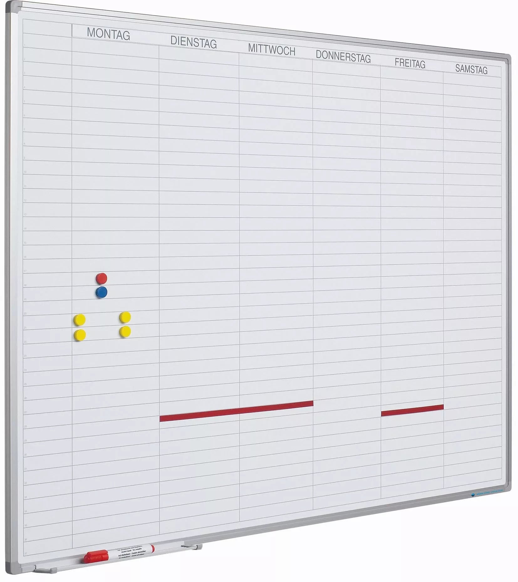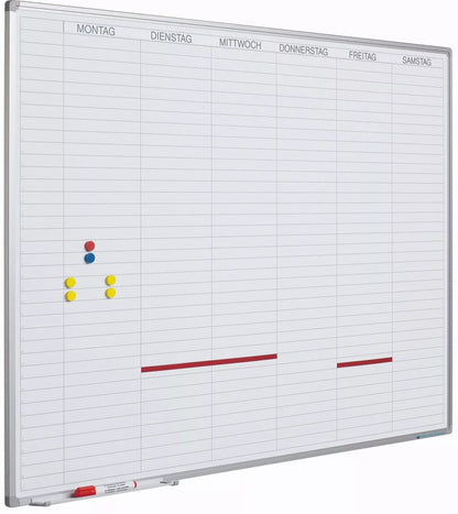Arbeitstagesplaner mit horizontaler Einteilung von Montag bis Samstag mit 37 befüllbaren Positionen unter jedem Tag. Ausgestattet mit eloxiertem Aluminium-Softline-Profil, inklusive Montagematerial, Markierungsschale 30 cm und magnetischer horizontaler Tagesleiste.