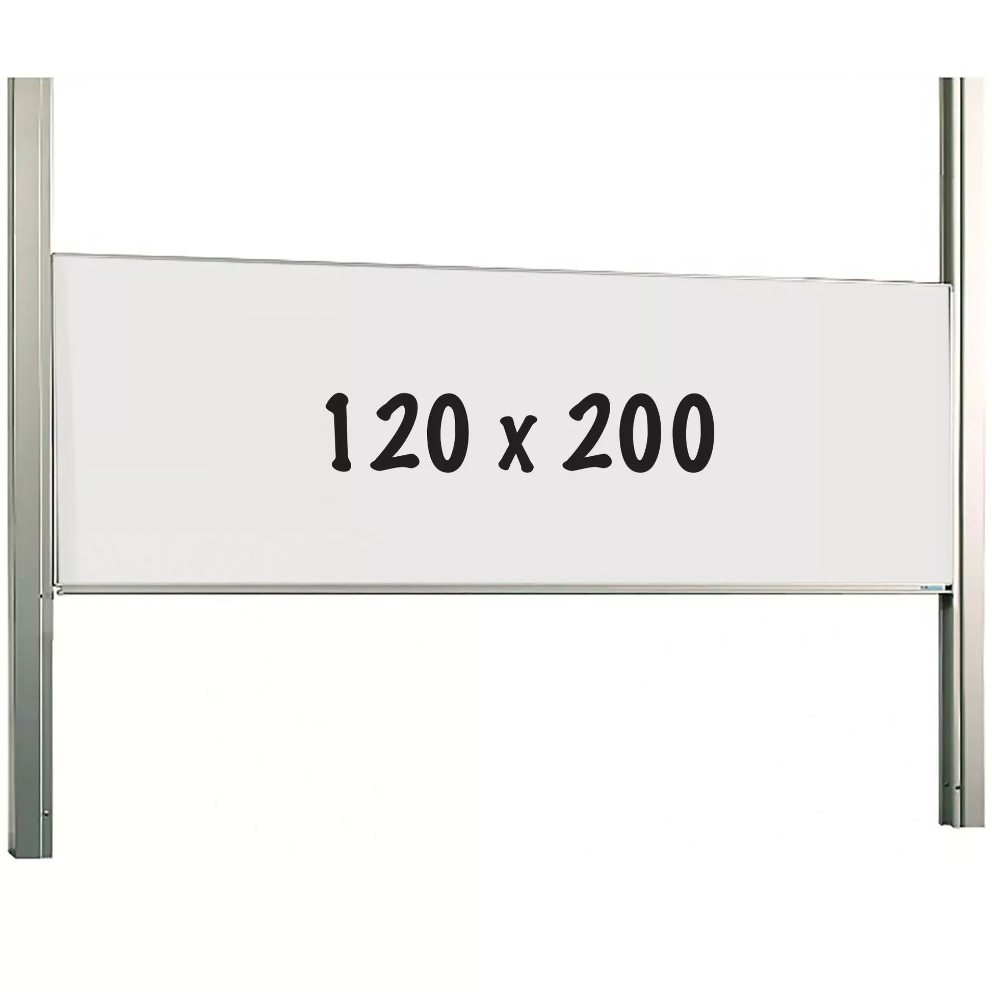 Tafel mit 1 Schreibfläche aus emailliertem Stahl weiß (800C) oder grün. Eloxiertes 19-mm-Aluminiumprofil mit Kunststoff-Eckstücken und Kreideauffangrinne. Montage zwischen zwei Säulen, Standardhöhe: 265 cm. Längere Spalten: optional.