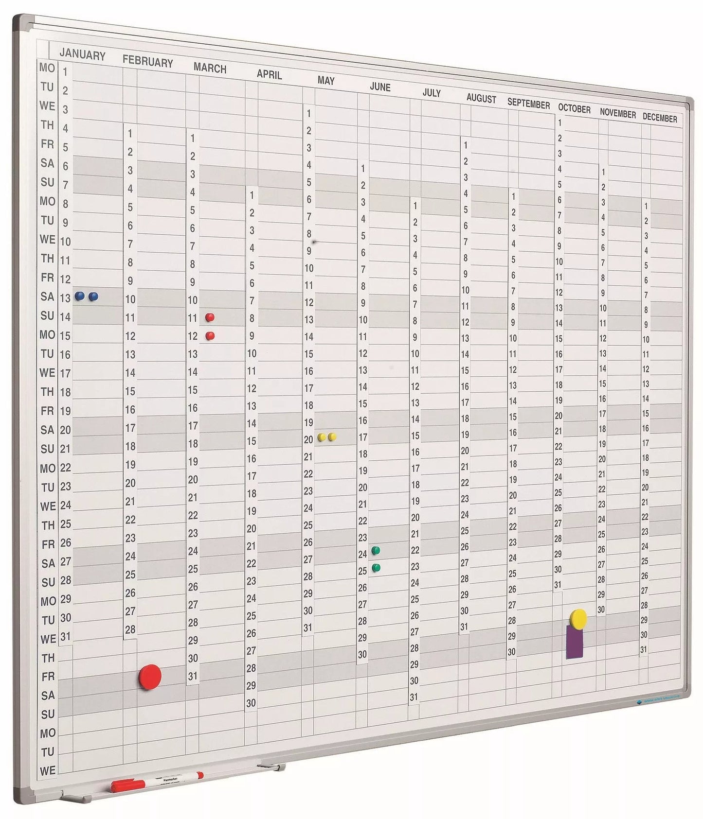Whiteboard PRO Florentino - Emaille-Stahl - Inkl. Monats-/Tages-/Zahlenstreifen – Wochenplaner – Monatsplaner – Jahresplaner – magnetisch – Weiß – Englisch – 90 x 120 cm